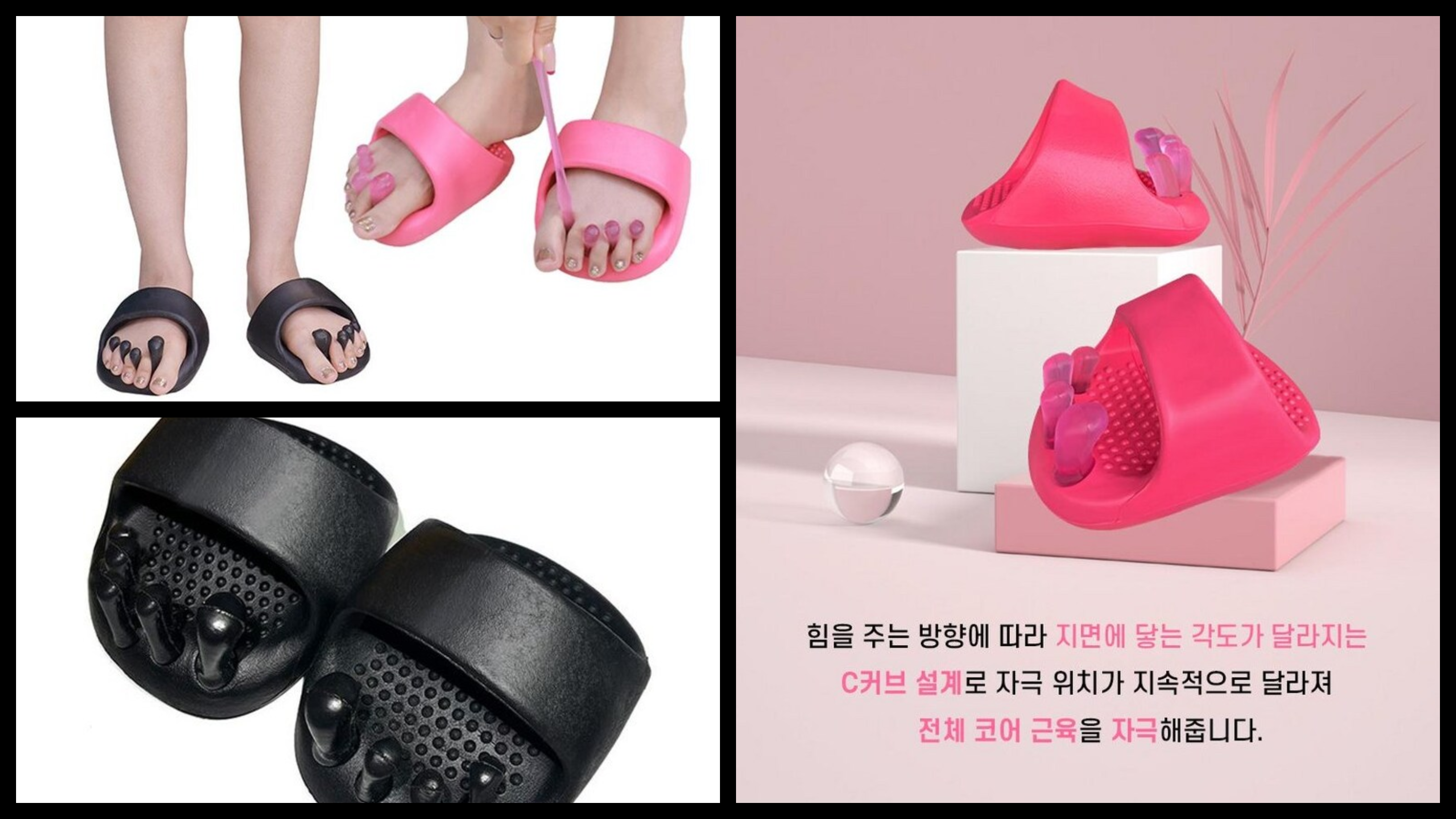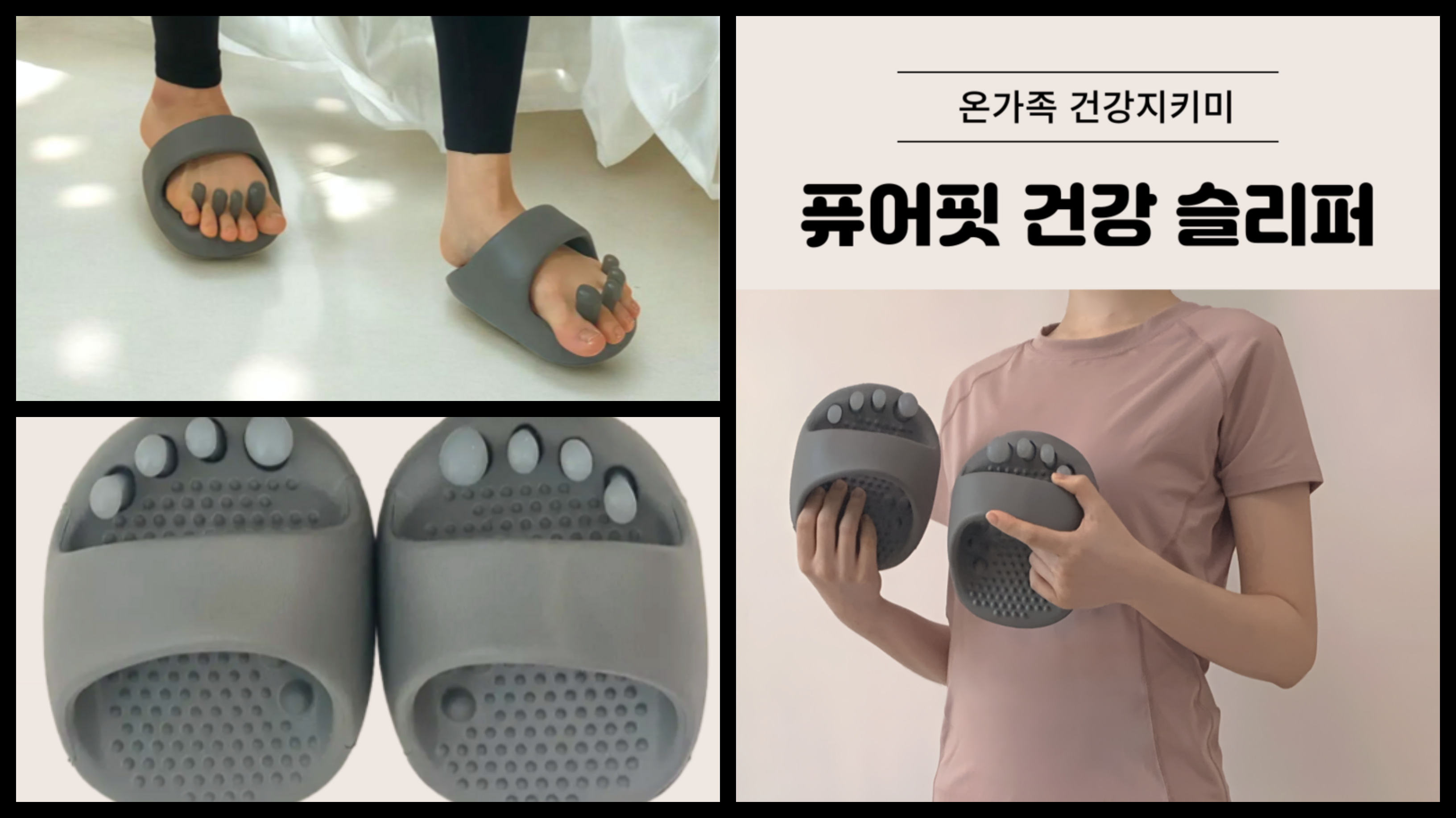 필라테스 원리를 응용해 자세 교정·하체 스트레칭·다이어트 보조 효과를 노린 건강 슬리퍼입니다.